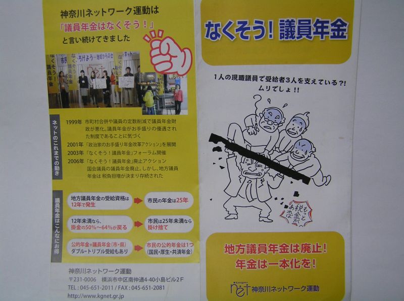 神奈川ネットワーク運動は1999年から「議員特権」としての「議員年金制度」のおかしさに気づき、2001年から「廃止」にむけての運動を行ってきました。