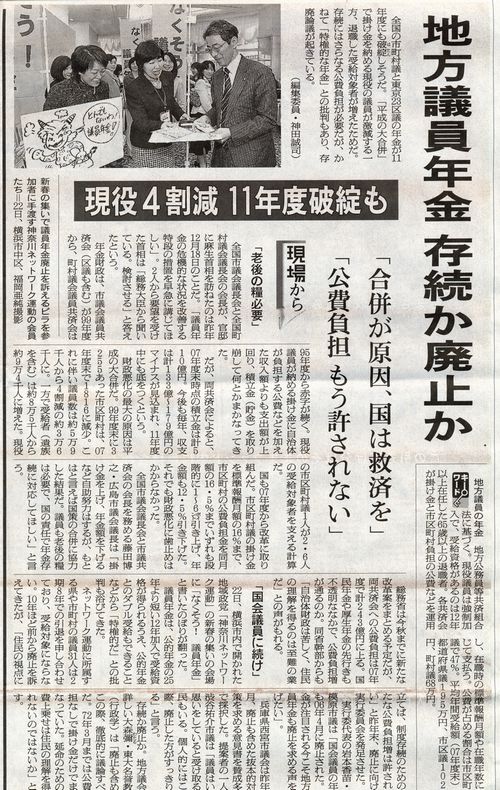 神奈川ネットワーク運動は、議員年金制度廃止を訴えてきました。2006年の「国会議員の議員年金制度廃止」を実現しました。そして更に「地方議会の議員年金制度廃止」を求め、県下の地域ネットが中心となり各行政区毎に、「議員年金の優遇された、特権制度」に反対し、廃止に向けての請願署名活動を展開してきました。横浜では、市民に対して駅頭、街頭活動を実施し、6月10日に各地域ネットで集めた「議員年金廃止を求めた請願署名」を市の議長宛に提出しました。最終筆数は合計1808筆でした。これにより市会運営委員会が6月17日に開催され、審議がおこなわれましたが、結果は残念ながら否決となりました。