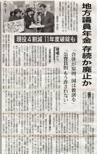 質問項目の一つ目としては「共済会の財政状況はどうか」質したところ、事務局側からは「あと2年で破綻する」旨の回答があり、二つ目には「議員年金制度の掛金と公費負担分の変化について」は「公費負担金率が高くなっている」実態を明らかにさせました。三つ目には「他の自治体でも廃止の方向で意見書提出の動きについて」は「西宮市、雲仙市、茨城県で廃止を含めた抜本的な検討を求める意見書が採択された」とのやりとりを行うことが全国の動向について触れさせることが出来ました。
