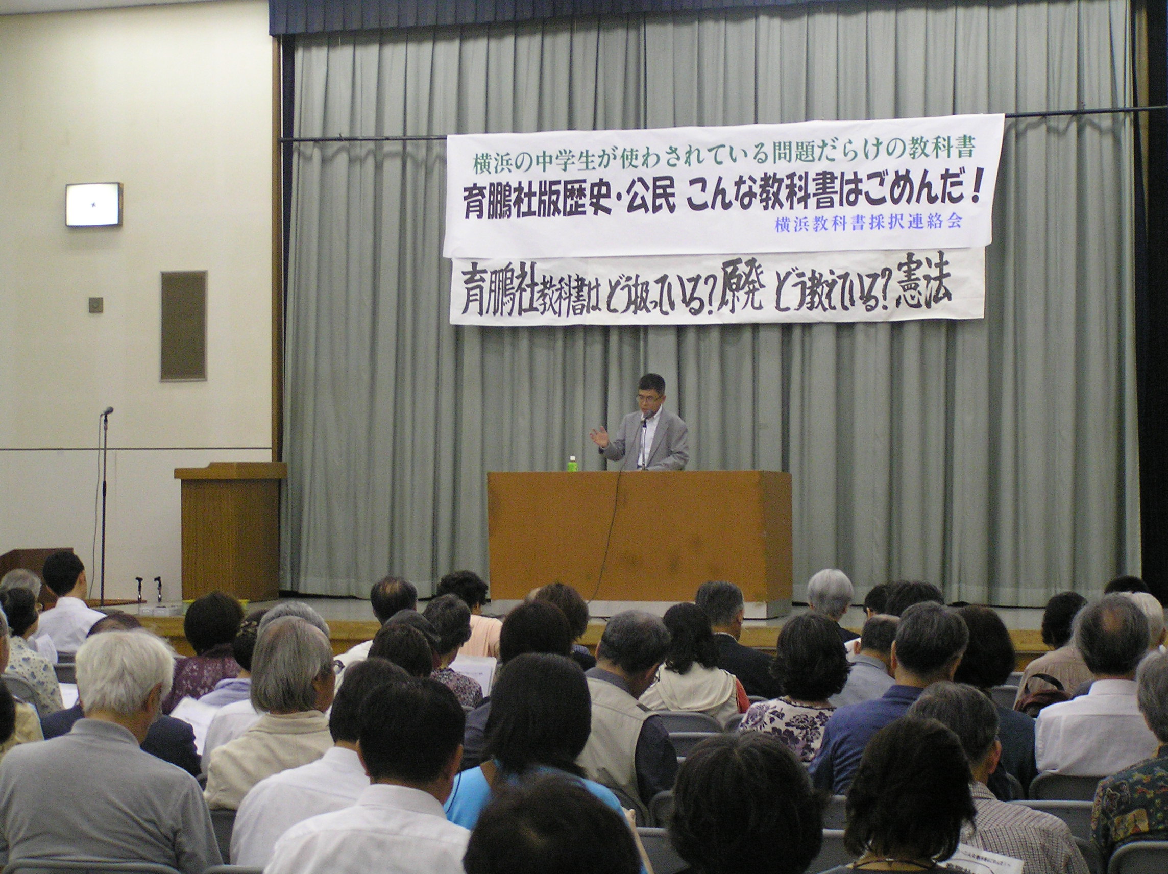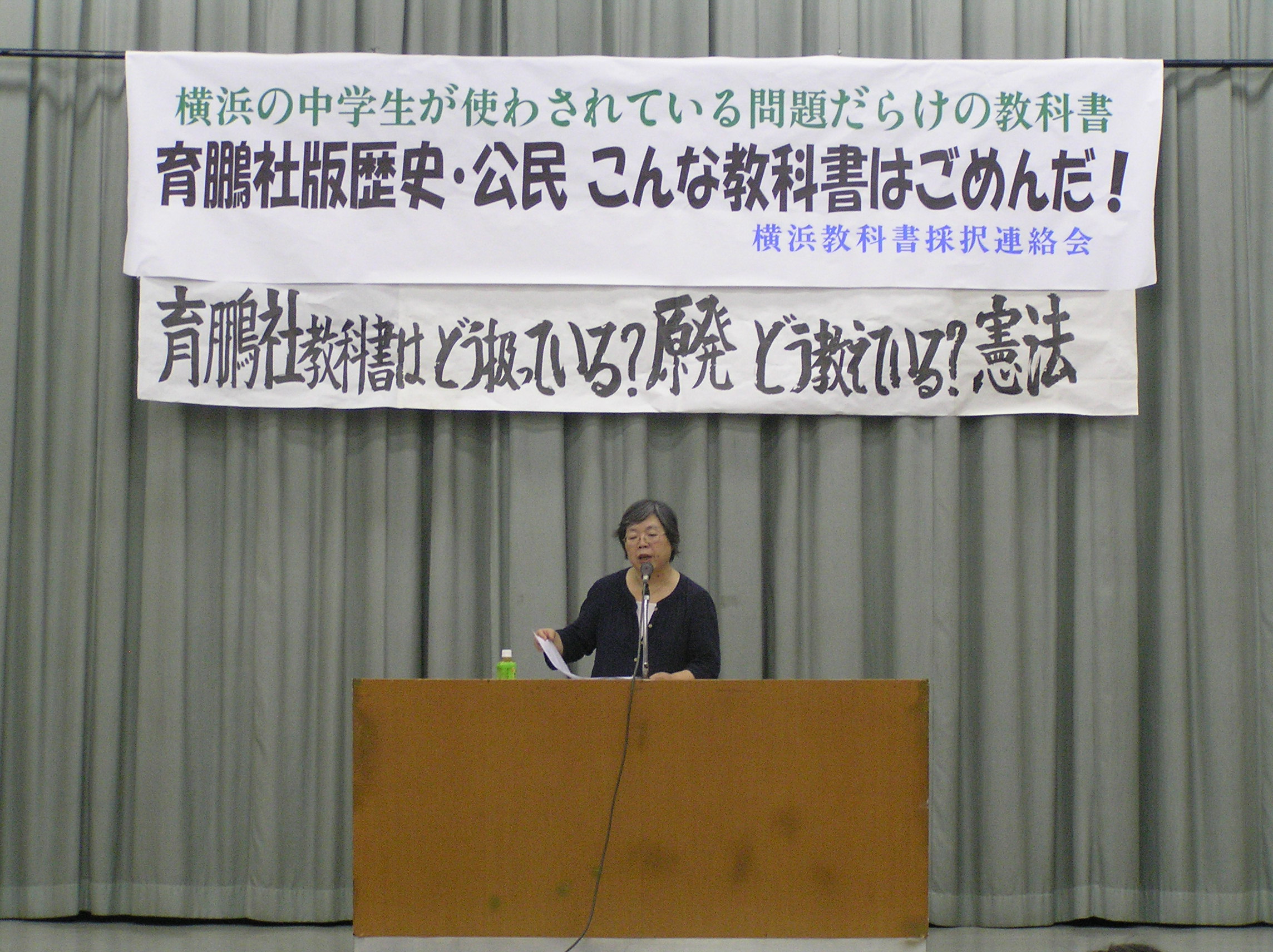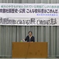 6月22日午後6時30分~かながわ県民センターホールにて、「横浜教科書採択連絡会」主催のもと「こんな教科書はごめんだ!」集会が開催されました。この横浜市教科書採択連絡会は「新しい歴史教科書をつくる会」系の「自由社」「育鵬社」の教科書採択に反対する市民運動団体、個人の参加によって結成されています。