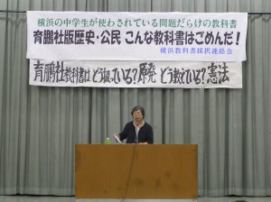 私たちは緑ネットのアピール、チラシ撒きでは「新しい歴史教科書をつくる会」系の教科書が横浜市全区、中学校に採用されたことに危機感を感じ、反対運動を行なっていることを主張させて頂きました。